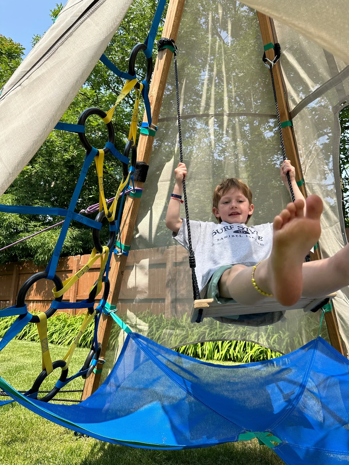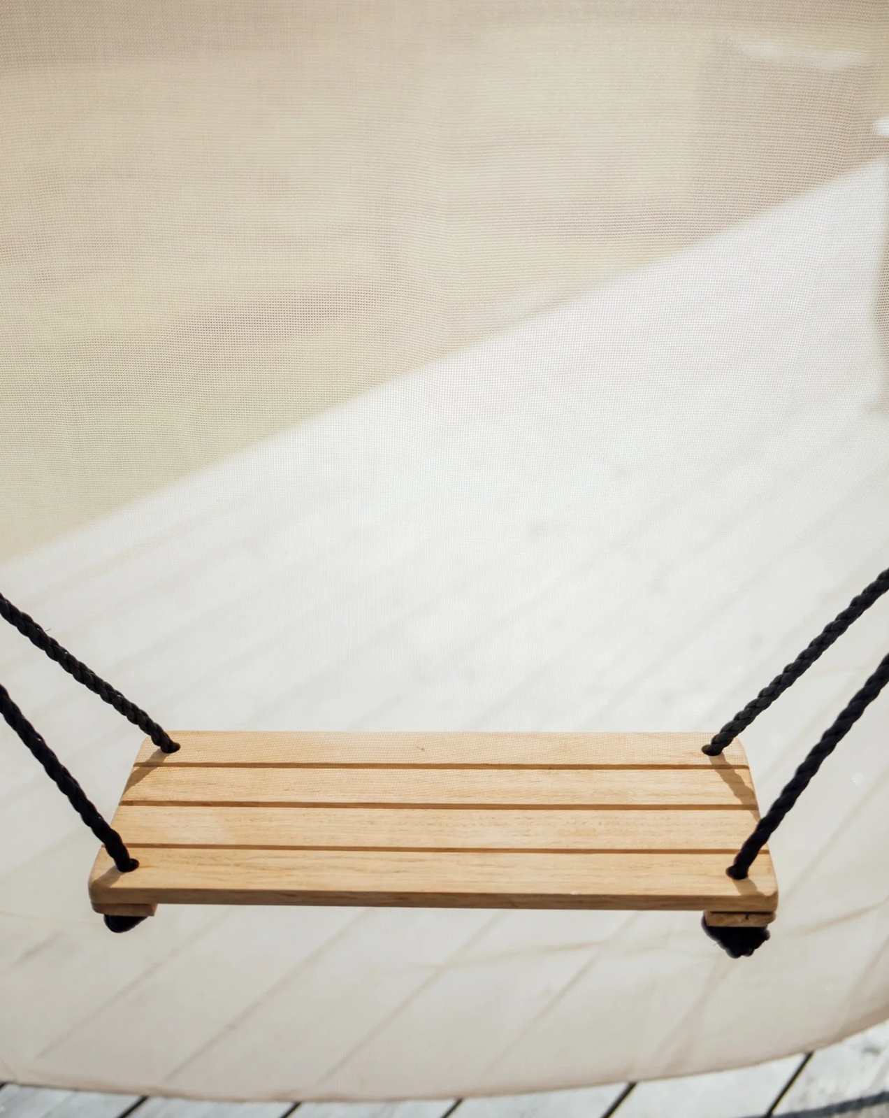 Perfect for story time or snack breaks, a spot for your morning coffee, a place for teens to read or do homework, or to rest a well-earned beer after play. And when the mood strikes, it doubles as a swing.